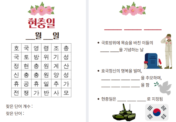 | 현충일 유아 초등 낱말찾기 어휘력 워크시트 무료 배포 (1) | 2024.06.04 |