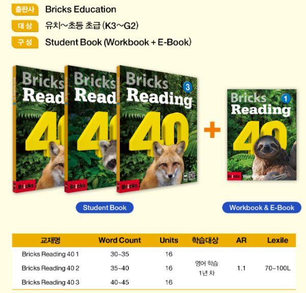 브릭스 교재는 stedent book과 work book + E book으로 구성되어 있는 리딩 교재입니다. 파닉스 학습을 마친 다음단계로 영어 읽기를 시작하는 아이들이 필수 어휘와 패턴을 재미있게 읽히며 영어 리딩의 기본기를 다질 수 있습니다.