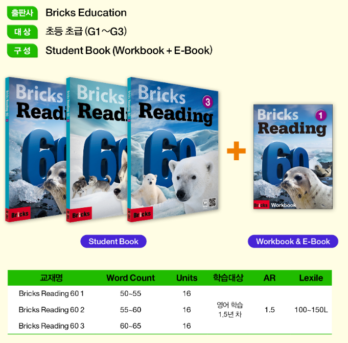 브릭스 교재는 stedent book과 work book + E book으로 구성되어 있는 리딩 교재입니다. 파닉스 학습을 마친 다음단계로 영어 읽기를 시작하는 아이들이 필수 어휘와 패턴을 재미있게 읽히며 영어 리딩의 기본기를 다질 수 있습니다.