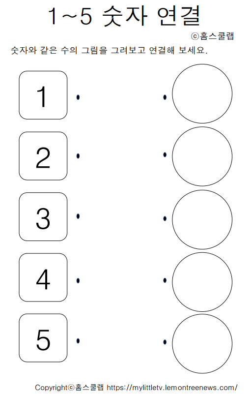 1~5까지 숫자 연결하기를 통해 수의 감각을 익힐 수 있는 3세 4세 5세 홈스쿨링 산수 학습지를 준비해 보았습니다.
