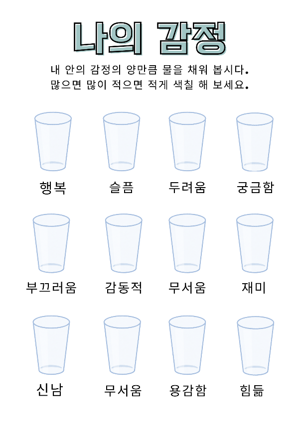 아래의 감정 워크시트에는 12개의 감정이 있습니다. 내 안의 현재 감정만큼 물컵을 색칠해 보고 대화하거나 발표하는 시간을 갖아보는 것을 추천합니다.