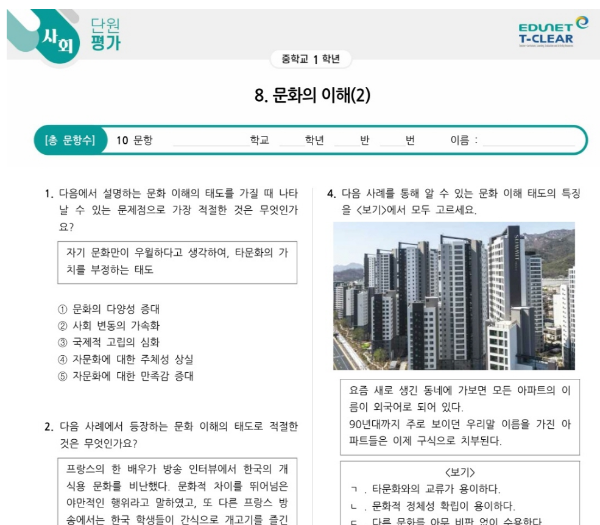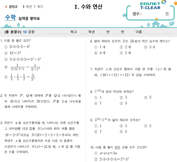 중학생 단원평가(출처 : 에듀넷티 클리어)