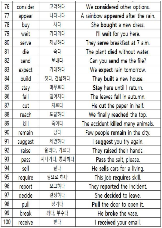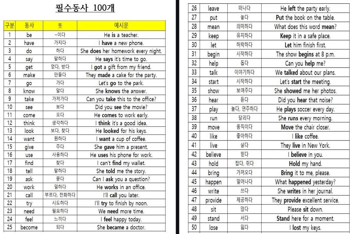 필수 동사를 이해하는 것은 영어 학습의 기반이 되며 문법과 어휘를 효율적으로 익히고 실제로 영어를 사용하는 데 필수적입니다. 필수 단어 100개만 익혀도 초등영어, 중등영어, 수능영어, 토익, 토플, 취업 영어 등 라이팅, 리딩, 스피킹, 리스닝 등에 능수능란하게 영어에 활용할 수 있습니다.