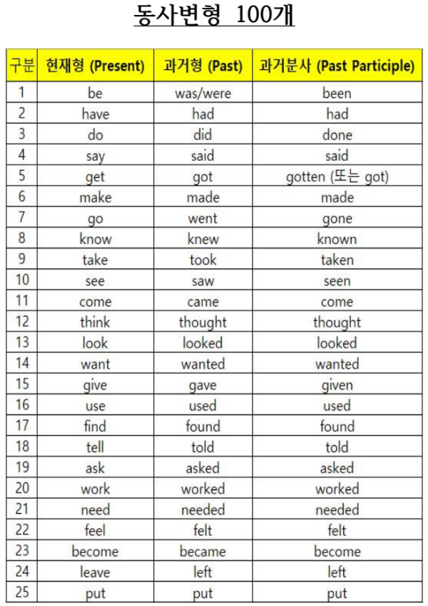 영어에서 동사 변형은 문법적으로 정확한 문장을 구사하고 의사소통의 명확성을 높이기 위해서입니다. 영어의 동사는 시제, 주어, 태, 및 형식에 따라 형태가 변화하기 때문에 적절한 구사를 통해 문장의 의미가 어색하거나 전달이 잘못될 수 것을 예방할 수 있습니다. 초중고등 영어뿐만 아니라 토익, 토플 등 성인 영어에서도 기본이 되는 영어 동사변형 100개를 필수로 외우시길 바랍니다.