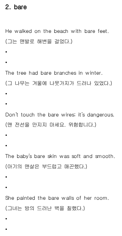 bare라는 단어를 활용하여 쓸수 있는 간단한 문장을 여러가지 샘플 라이팅으로 참고 하시고 연습을 하시어 동사, 시제등의 변형과 살을 붙여 더 풍부한 문장쓰기를 연습해 보세요.