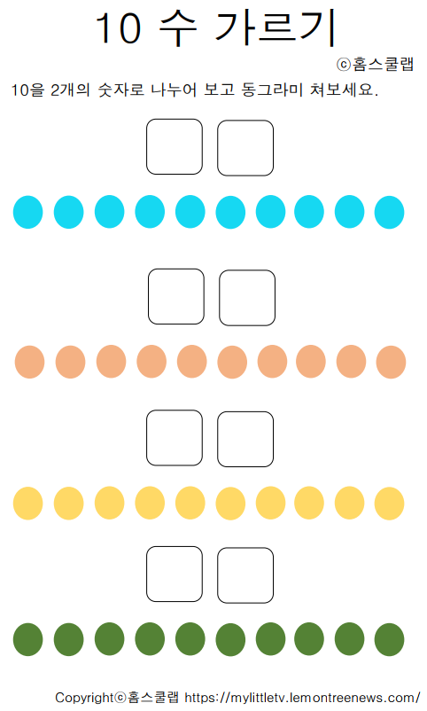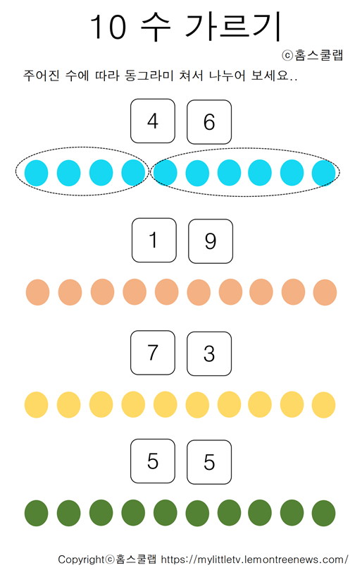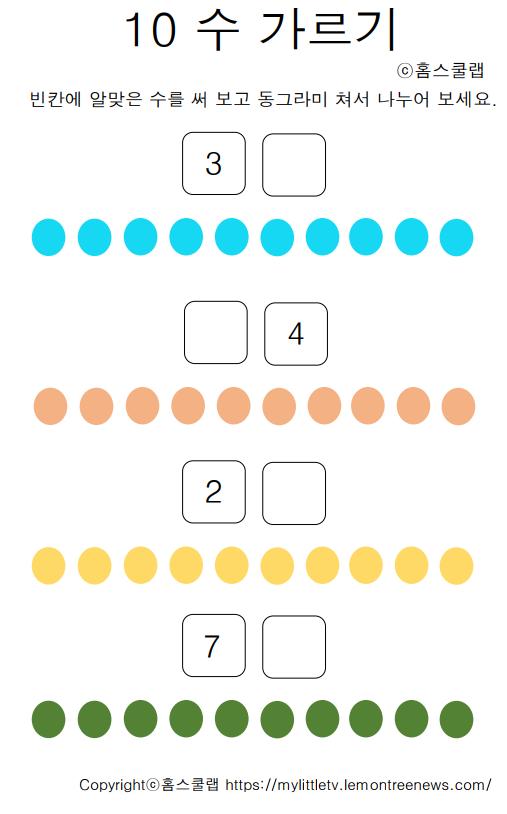 10의 수를 2개로 나누어 봄으로서 10의 수를 만들어 보는 과정을 통해 수의 기초를 차근차근 다져 나갈 것입니다. 엄마표 홈스쿨링 학습지를 아이들에게 재미있고 긍정적인 습관을 마련해 주세요.