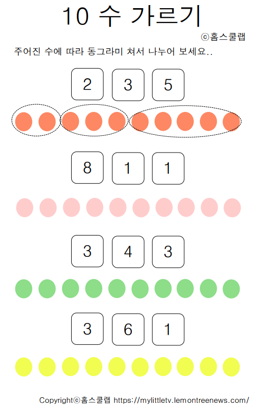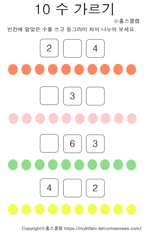 안녕하세요. 숫자에 대한 친근감과 익숙함을 익히고 더불어 덧셈 뺄셈 등 연산의 기초 다지기가 될 수 있는 수 가르기 홈스쿨링 학습지를 준비해 보았습니다. 10의 수를 2개로 나누어 봄으로서 10