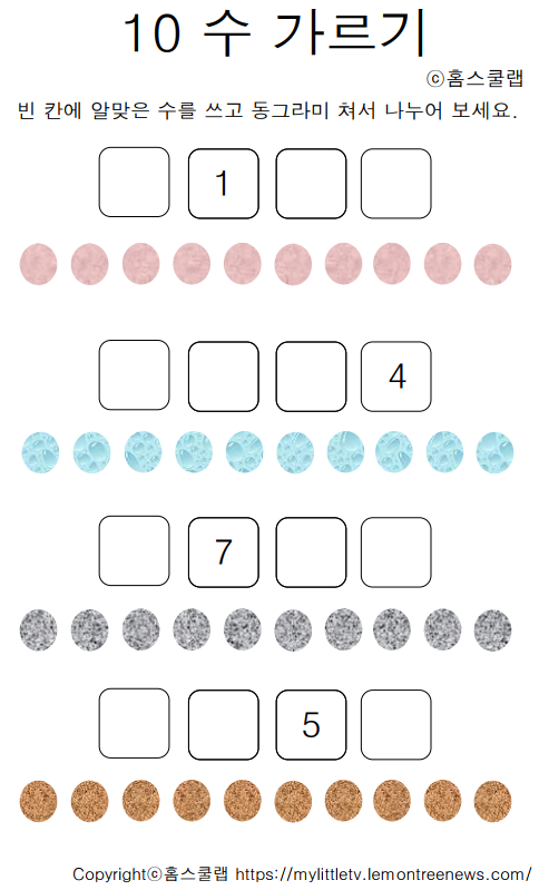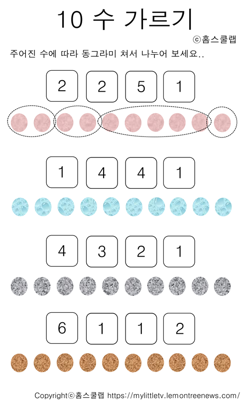 안녕하세요. 엄마표 학습지 홈스쿨 랩입니다. 10의 수 가르기 두 번째 시간입니다. 전 시간에 10의 수 2개로 가르기를 연습했었는데요, 이번에는 10의 수를 3개로 가르기 연습을 할 수 있는 학습지
