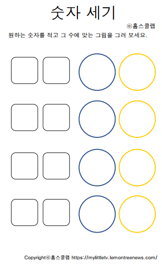 주어진 수와 같이 수만큼 그림을 그려보고 또 역으로 주어진 그림의 수만큼 셈을 하는 과정을 통해 쉽고 재미있게 숫자 게 대한 개념을 익혀나가기 바랍니다.