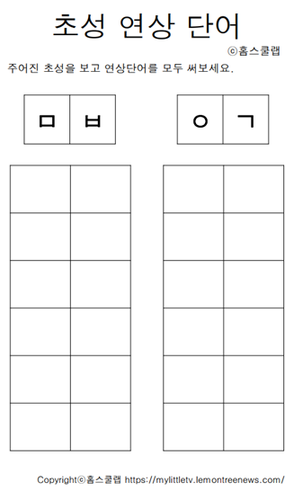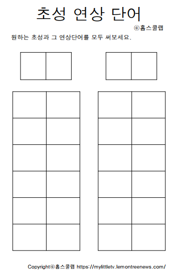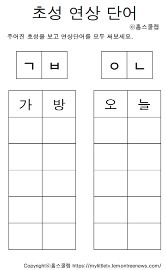단어의 초성만 보고 단어를 추리하여 맞추는 초성 놀이 홈스쿨링 학습지를 준비했습니다.