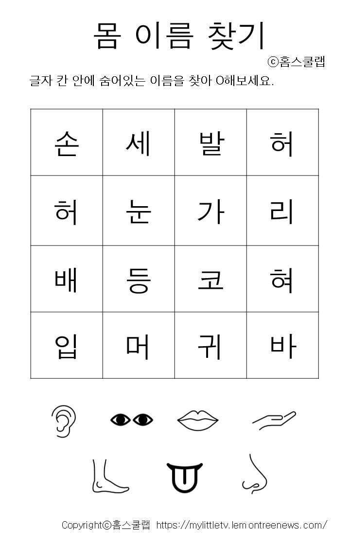 학습주제 영유아 신체이름 찾기 한글 공부