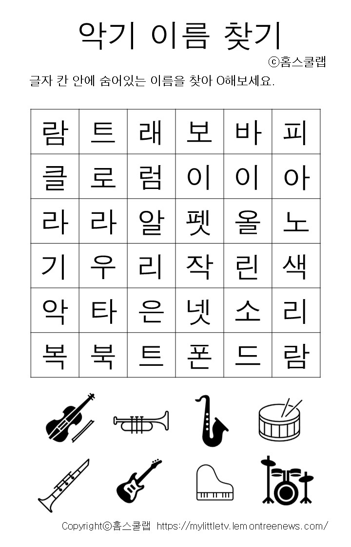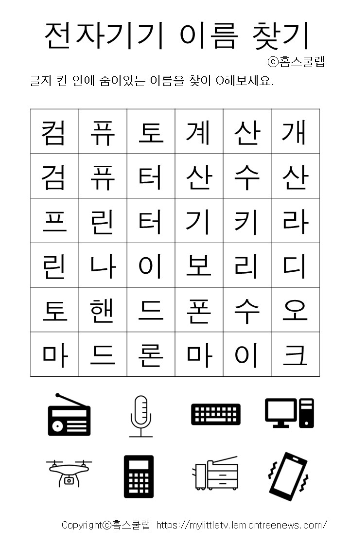 학습영역 한글단어찾기 게임을 통해 악기이름, 전자기기 이름 어휘력 향상