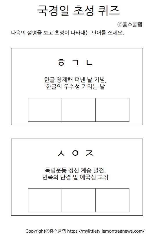 국경일 초성퀴즈를 통해 국경일의 의미를 다시한번 새겨보고 기억함으로써 인지합니다. 또한 초성퀴즈의 국경일이 몇 월 며칠인지도 알아보며 더 심도 있게 의미를 되새겨 봅니다.