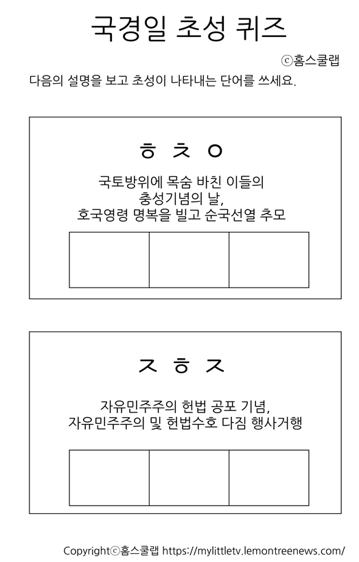 국경일 초성퀴즈를 통해 국경일의 의미를 다시한번 새겨보고 기억함으로써 인지합니다. 또한 초성퀴즈의 국경일이 몇 월 며칠인지도 알아보며 더 심도 있게 의미를 되새겨 봅니다.