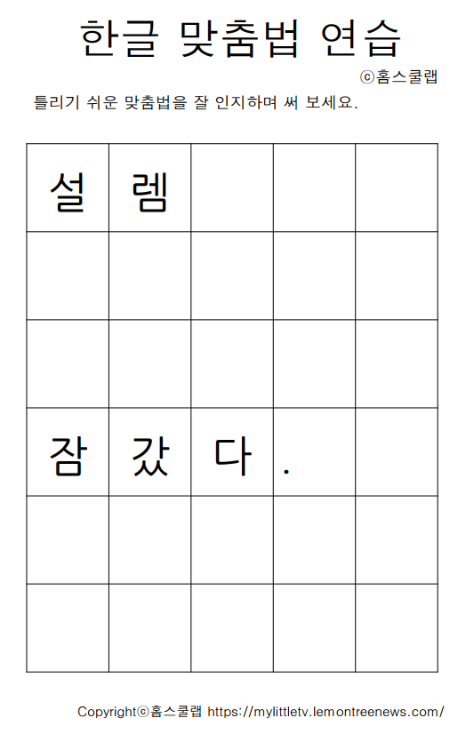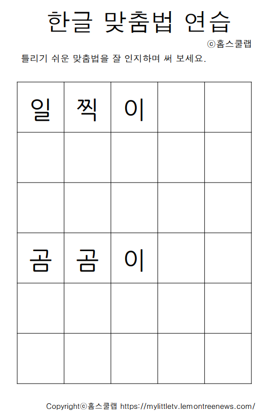 | (무료나눔)틀리기 쉬운 한글 맞춤법 연습 1탄 초등 문해력 학습지 (0) | 2023.06.15 |