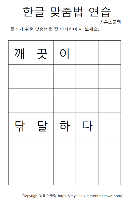 | (무료나눔)틀리기 쉬운 한글 맞춤법 연습 1탄 초등 문해력 학습지 (0) | 2023.06.15 |