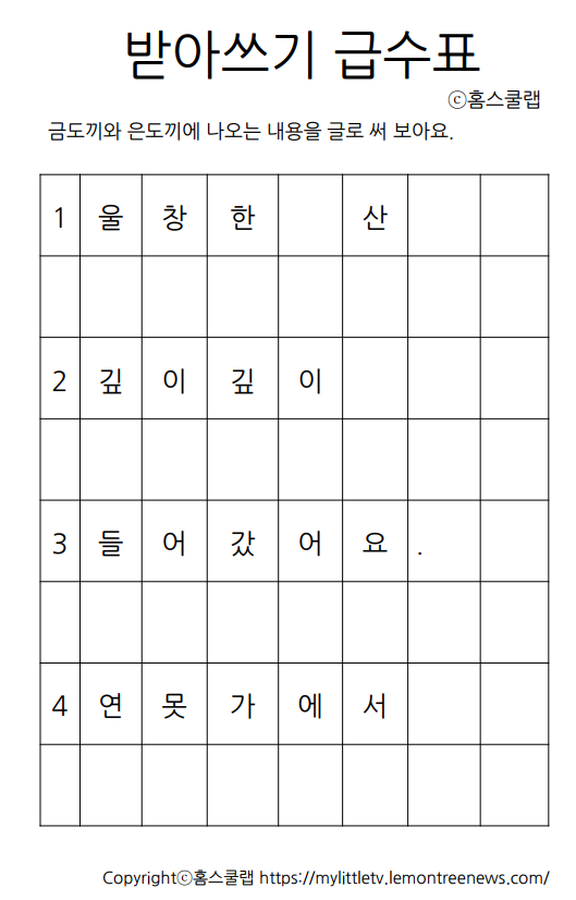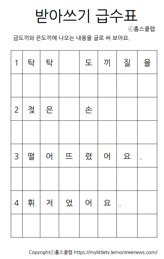 | (무료학습지) 초등 받아쓰기 급수표 금도끼와 은도끼 2탄 (0) | 2023.06.17 |