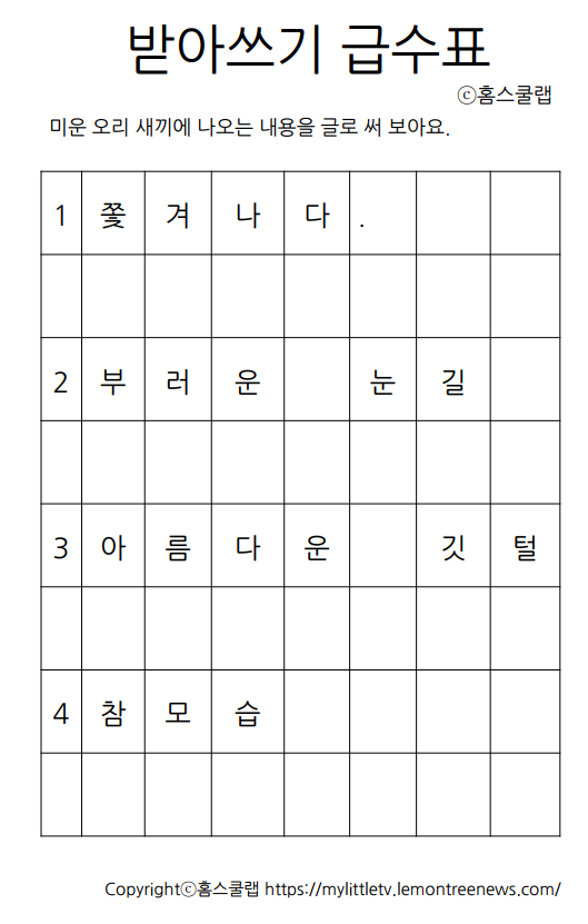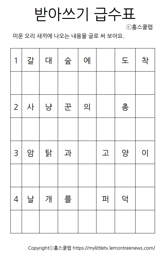 전래동화 미운 오리 새끼 내용을 기반으로 만든 축약내용으로 초등학교 받아쓰기 급수표를 만들었습니다. 미운 오리 새끼에 나오는 내용을 요약한 받아쓰기 연습을 통해 나머지 내용을 유추하여 말로 표현할 수 있는 영역까지 학장 하여 메타인지 사고력을 증진을 기대해 봅니다.