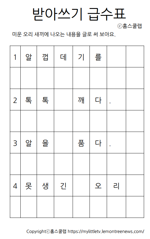 (무료나눔) 초등 받아쓰기 급수표 미운오리 새끼 연습