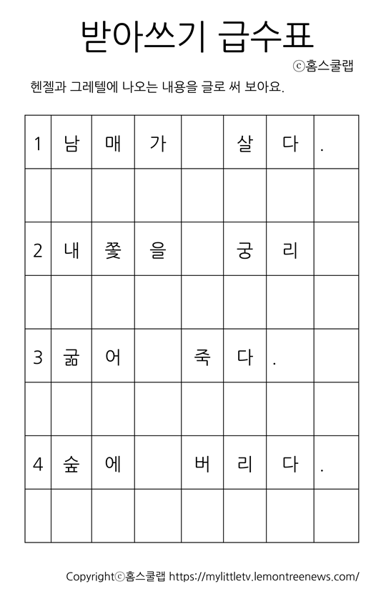 (무료학습지) 초등학교 받아쓰기 연습 급수표 헨젤과 크레텔 기반