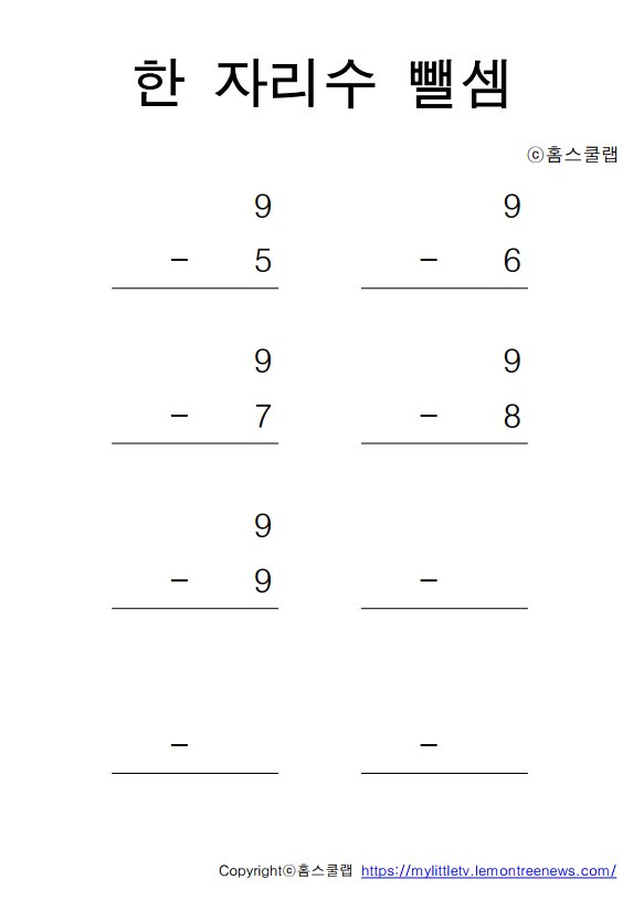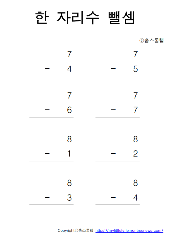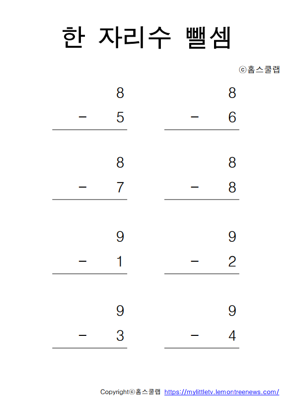 (무료나눔) 초등 한 자리수 뺄셈 연습문제 학습지