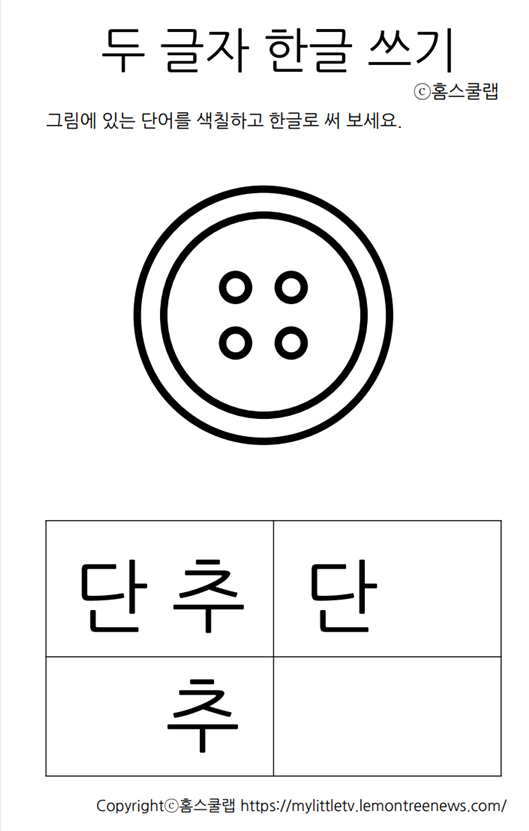 | (무료나눔) 유치원 초등 한 글자 한글쓰기 연습 학습지 1탄 (0) | 2023.06.22 |