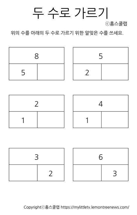 | (무료PDF) 1부터 10까지 두 수로 가르기 예비초등 일일수학 학습지 (0) | 2023.06.26 |