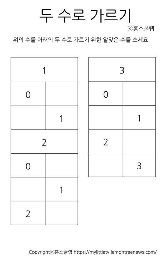 (무료PDF) 한 자리수 두 수로 가르기 가로 초등 일일수학