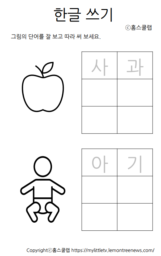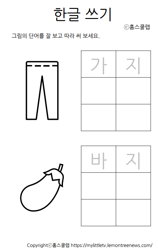 (무료한글) 받침 없는 두 글자 쓰기 연습 엄마표 학습지 hangul